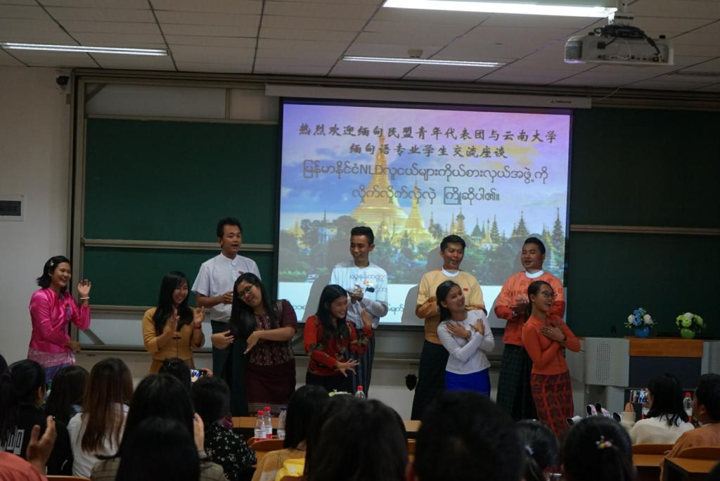 激烈的讨论与精彩的发言总结使大家群情激昂,随后的才艺表演也给此次的讨论会增添了一抹亮人的色彩。缅甸语专业的学生首先献歌一曲——英文版《友谊地久天长》。在悠扬的歌声中,中缅青年双方的情谊也在不断升华,现场气氛逐渐走向高潮。诗歌朗诵《赠缅甸友人》获得了大家的一致好评,“我住江之头,君住江之尾;彼此情无限,共饮一江水;我溪川上流,君喝川下水;川流永不息,彼此同甘美。彼此为近邻,友谊长积累;不老如青山,不断似流水;彼此地相连,依山复靠水;反帝得自由,和平同一对。彼此是胞波,语言多通汇;团结而互助,和平力量伟;临水叹浩淼,登山歌石垒;山山皆北向,条条南流水。”这首由陈毅元帅所写的诗歌,言辞质朴却又饱含深情,赞美与歌颂了中缅两国密不可分的胞波情谊,被几代中缅人民广为传唱,经久不息。随后的歌舞表演点燃了现场的热烈氛围,推动交流会走向了高潮。缅甸民盟青年代表团的友人们也上台纵情歌舞,台上台下一片欢腾。此刻的欢乐,不分国界,无谓差异。最终,伴随着主持人对中缅两国友谊万古长青的祝愿,此次座谈交流会接近了尾声。