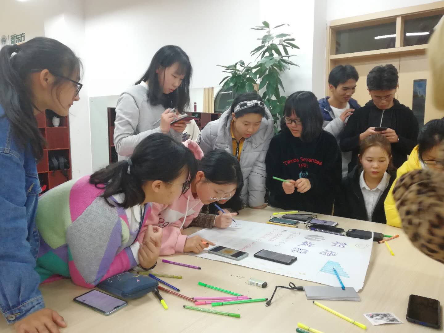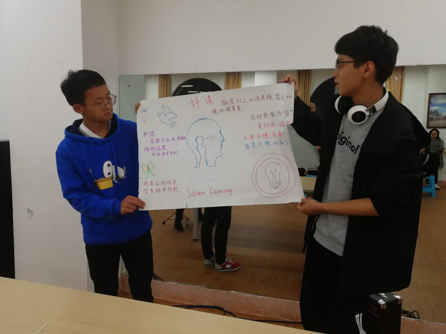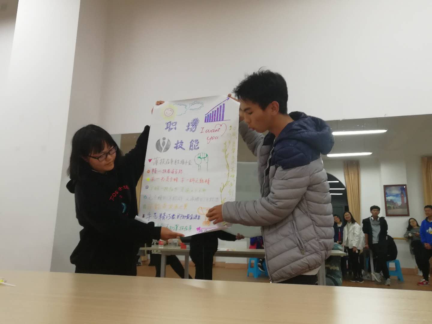 对于3个组,杨老师分配了不同的任务,首先让他们在2分钟之内讨论在职场中最重要的两个能力,各组各抒己见,有人际交往能力的,应变能力的,处理矛盾能力的,沟通能力的,个人能力的,大家各抒己见。针对大家的答案,杨老师给每个组选定了相对的主题,分别为人际交际能力,应变能力能力,专业技能,每个组分配一大张白纸,8支彩笔。由于第一组在活动开始时最先讨论出答案,可以享受最近的桌子椅子,另外两个组则要自己动手。第三组立马动手,第二组则要老师提醒才会行动。结果最后,第一组和第三组全部成员都有桌椅,但二组的部分同学只能站着。针对这个情况,杨老师适时提出在职场中资源是有限的,所以要自己积极主动争取做资源的拥有者与占有者。每个组在20分钟内,设计队名、口号,每人书写一句与主题相关的短句或词组等。计时开始,有的组开始分工,明确各自的任务,有的组开始查资料。在这个过程中,杨老师与两位观察员对各个组进行观察。时间结束后,每个组依次上台展示成果,每个组有各自的特色。从海报排版,内容的匹配度,讲解情况等考虑,杨老师选出了最优秀的一个组,并给他们送出数据线,湿纸巾等礼物。针对同学们的提问,杨老师积极解答,并提出了一系列建议。