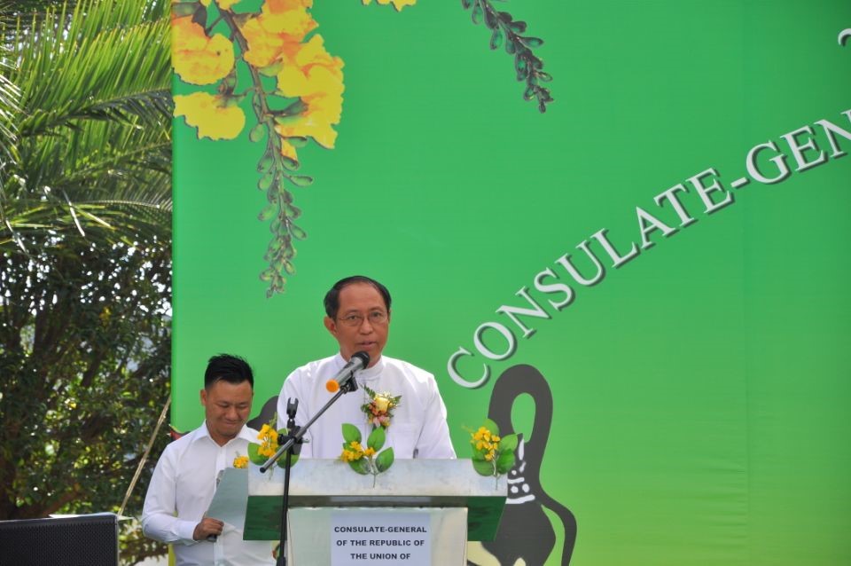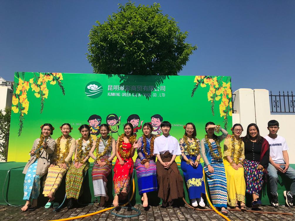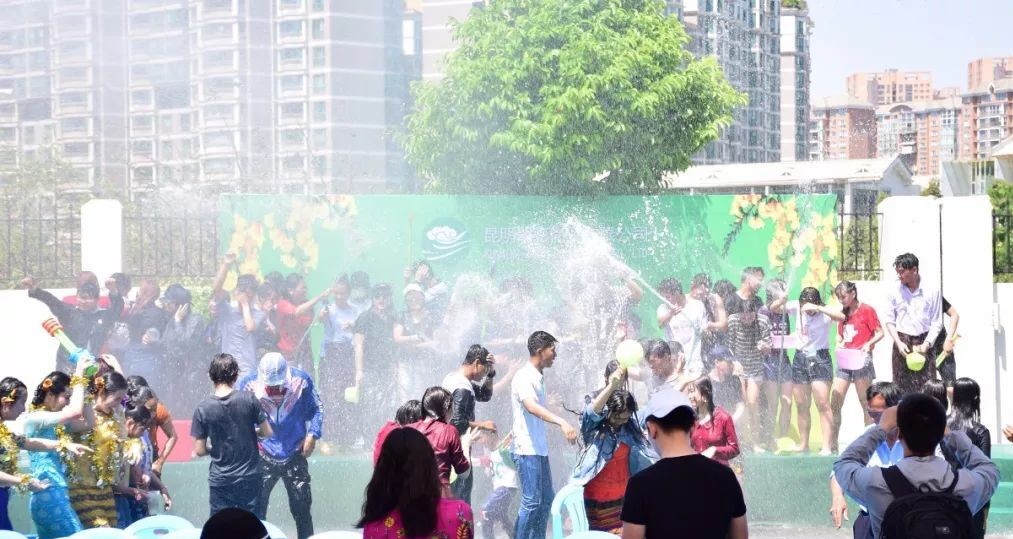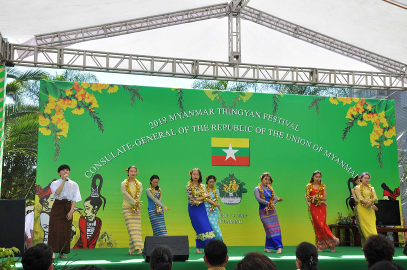 4月13日,缅甸联邦共和国驻昆明总领事馆举行泼水联欢活动,庆祝缅历新年。总领事吴梭柏携全体馆员与云南省人民对外友好协会会长,云南省人民政府外事办公室副主任,泰国、老挝、马来西亚驻昆明总领事馆总领事,云南大学副校长,缅甸在昆留学生代表,云南大学、云南师范大学、云南民族大学、昆明理工大学等院校的缅语系师生代表共300余人欢聚领馆,同庆缅历新年。云南大学外国语学院缅甸语专业学生及缅甸留学生共11人参加了此次泼水节活动的文艺表演。