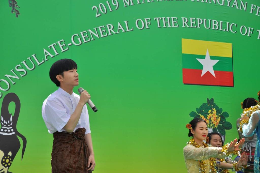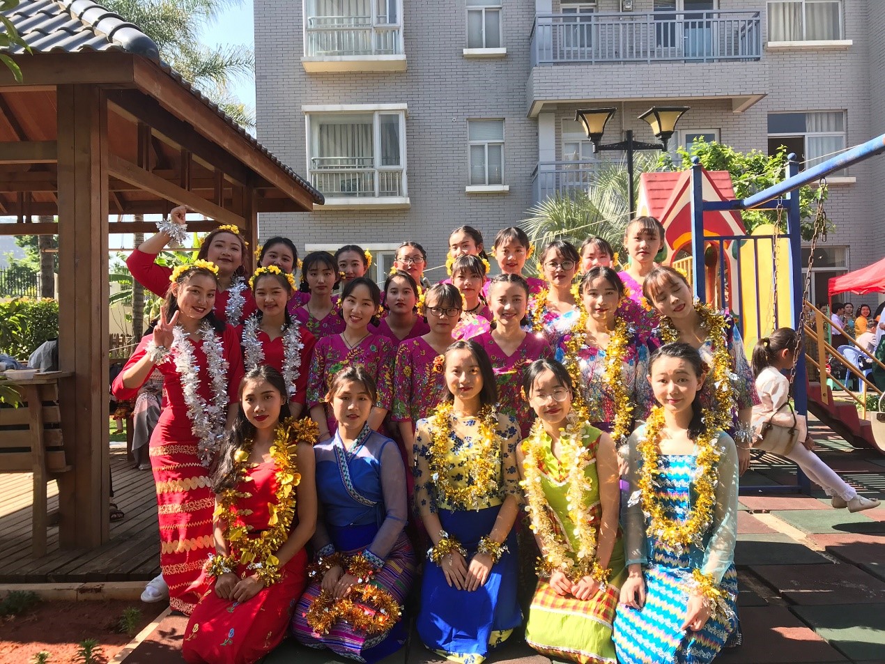 此次泼水节文艺表演共有16个节目,云南大学外国语学院缅甸语系本科学生和云南大学工商管理专业的缅甸留学生共同表演了缅甸歌舞,亲身体验了缅甸传统歌舞的独特魅力。本科二年级的张元浩同学身穿缅甸隆基演唱了缅甸语歌曲《泼水节的雨》。伴舞的女生们穿着特敏,头戴紫檀花(一种特属于缅甸泼水节的花),看起来优雅大方。同学们自信大方的精彩表演展现了外国语学院学生的风采。