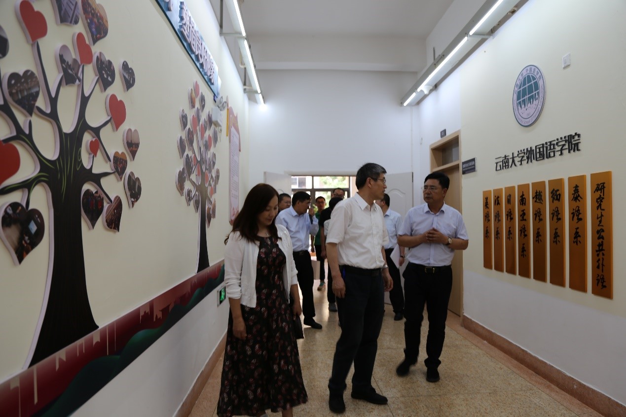 校长一行查看了外国语学院的场地,了解了相关设施和区块情况。