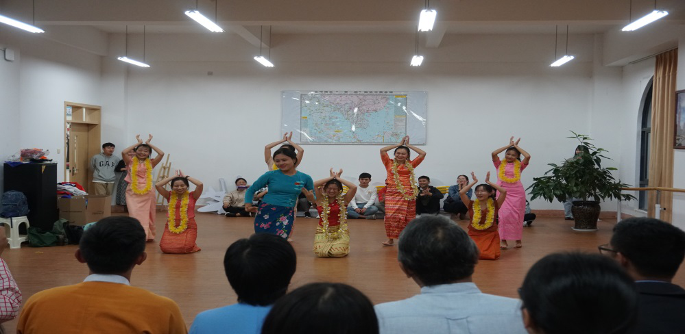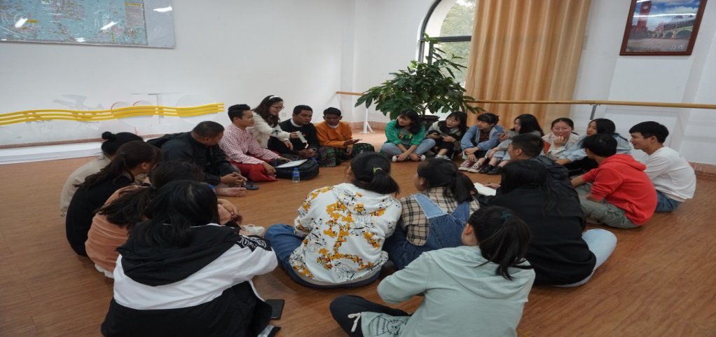 讲座开始前,2019年缅甸民盟青年骨干交流研修班学员和缅甸语专业的学生们就中缅服饰文化、饮食文化、社交礼仪文化和影视文化四大主题展开了深入讨论和互动交流。交流过程中,同学们积极讨论,踊跃发言,主动向缅甸朋友请教,在学习和了解缅甸文化的同时,也尽自己所能向缅甸朋友讲述中国文化,共同去体验两国文化的异同。在各组同学将讨论成果一一总结汇报之后,缅甸语系的同学们表演了《彩云之南》《新年的雨》《谢谢你》等歌曲和舞蹈,体现了缅语系同学们对缅甸语言、文化和艺术方面的浓厚兴趣。接着,缅甸民盟青年骨干交流研修班学员们也都情不自禁为同学们歌唱《伊洛瓦底》,在这样的文艺表演中,再次迸发出文化和艺术交流的火花。