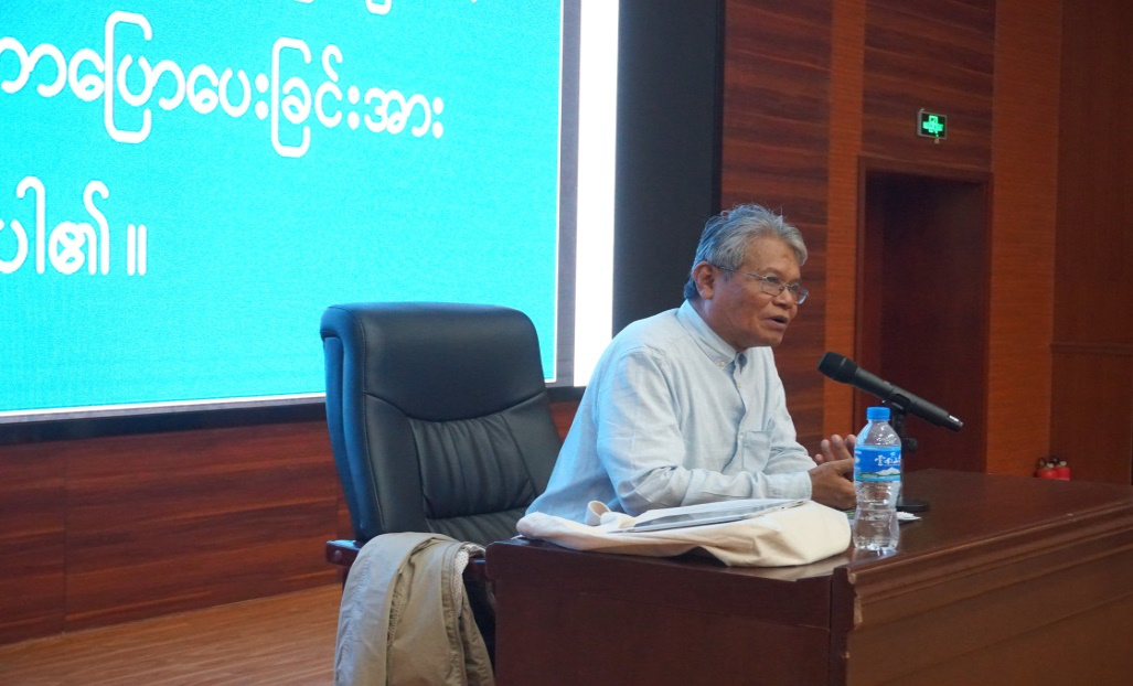 生动有趣的交流会结束后,缅甸著名诗人吴泰温为缅甸语系全体师生做了题为“回顾缅甸诗歌百年历程”的学术讲座。泰温先生1954年出生于缅甸,现任职于民族文学奖诗歌委员会。他的第一本诗歌文集是《初春的美梦》,于1978年和丹迎昂共同出版。后来又陆续在杂志上发表各种诗歌,并于2000年完全踏入缅甸文学界。于2003—2006年、2007年、2013年先后分别担任缅甸《缅甸踏依崩》和《班索坦艺术与文化杂志》的编辑。2010年获金珠文学奖(诗歌)。此外,他还进行儿童文学方面的创作,并于2016 年出版了《儿童诗歌》等,2019年出版了《在平坦的沙滩上绘画》。