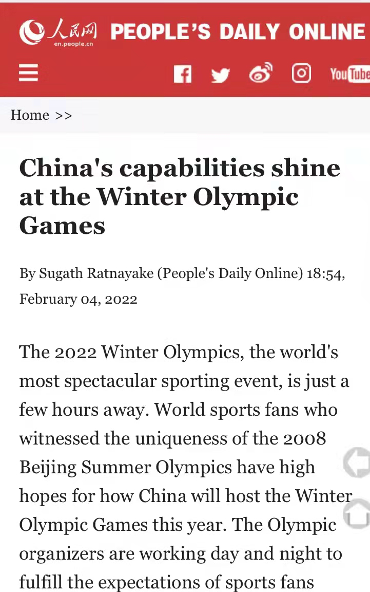 在这篇题为《中国实力在冬奥会上大放异彩》(“China's Capabilities Shine at the Winter Olympic Games”)的文章中,苏噶特盛赞了自2015年申奥成功以来,尤其在新冠肺炎疫情的笼罩下,中国为冬奥会准备工作所做出的巨大贡献,并认为本次冬奥会将充分展示中国的实力、韧性及活力。文中,苏噶特还就2022年北京冬奥会的主题口号、赛事组成、场地特点,以及在新冠肺炎疫情背景下中国所采取的一系列措施进行了介绍。