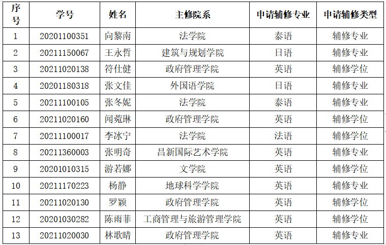 根据《关于做好2022年秋季学期辅修申请工作的通知》,外国语学院经过审核,现将2022年秋季学期辅修申请拟接收学生名单公示如下: