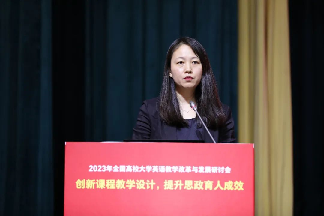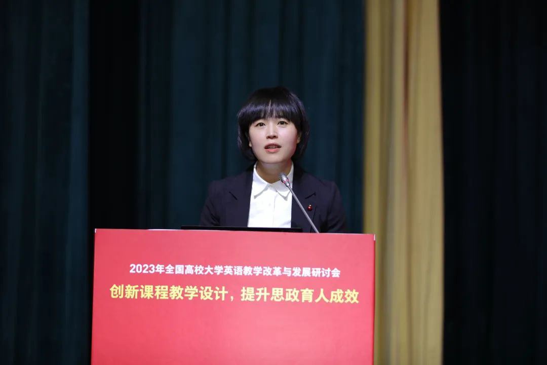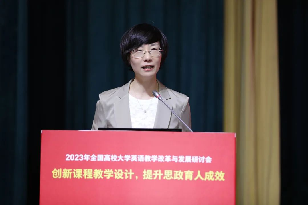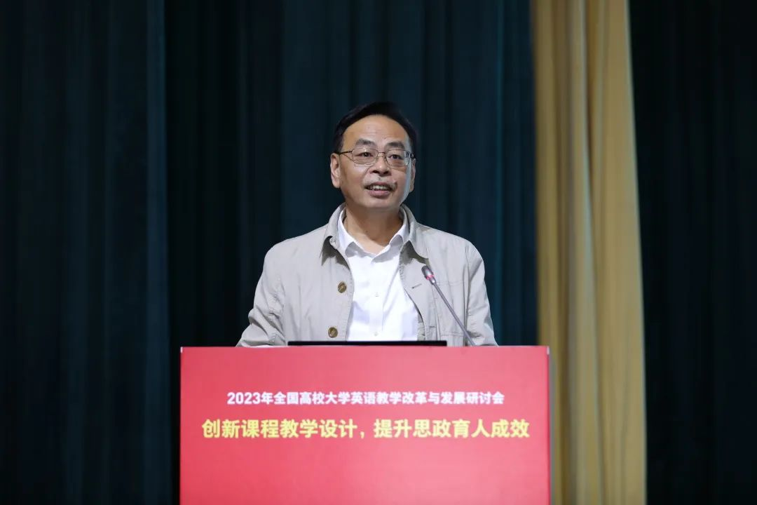 在开幕式以后,教育部大学外语教学指导委员会三位专家做了主旨报告,从不同角度阐述如何理解和贯彻“创新课程教学设计,提升思政育人成效”。全国大学外语教学指导委员会副主任委员、扬州大学俞洪亮教授做了《落实大学外语课程思政教育教学,深化大学外语教学改革》的报告。俞洪亮教授表示,大学外语教师要关注教育教学范式的转变、高等教育数字化转型、课程思政教育与服务“四新”建设等大学外语教学改革与发展动态,主动融入改革主流。俞教授从教学目标、教学内容、教学设计、教学方法与手段、教学资源、教学评价、教师教学能力等七大方面细致阐释了《大学外语课程思政教学指南》主要内容,并强调大学外语教师要树立思政教育思维,落实《教学指南》要求,在创新与实践中实现教师育人价值。