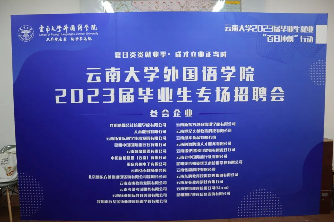 2023年5月23日,云南大学外国语学院2023届毕业生专场招聘会在外国语学院举行。本次活动由云南大学学生就业指导服务中心主办,云南大学外国语学院承办,旨在贯彻落实党中央、国务院关于“稳就业”“保就业”工作的重要决策部署,更好地满足广大用人单位的人才需求及广大毕业生的求职愿望,为用人单位和毕业生积极搭建双向选择的高效服务平台,助力外国语学院2023届毕业生实现更加充分和更高质量就业。