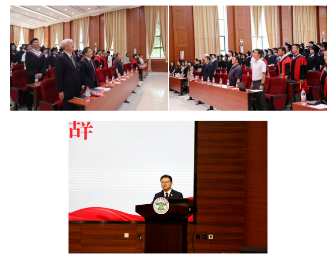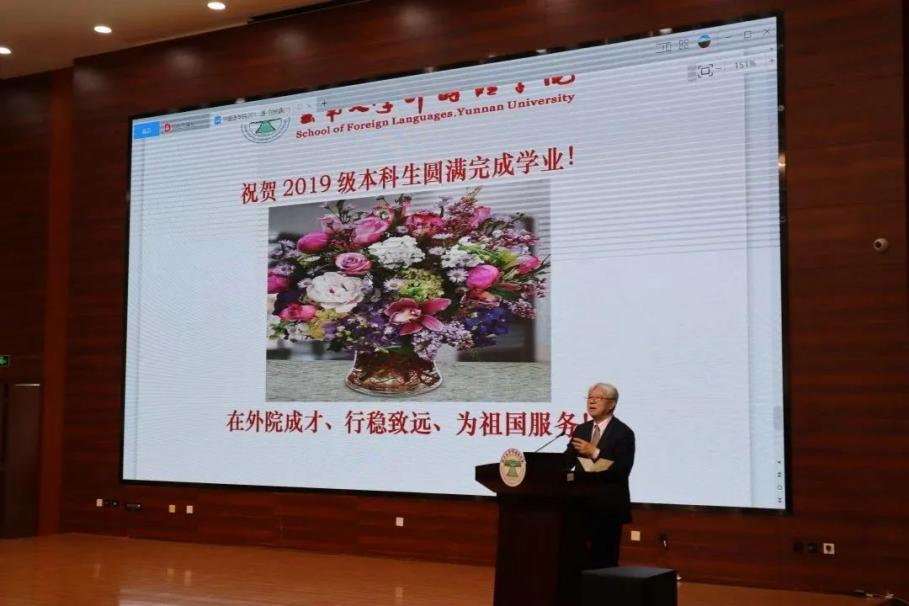 在全体与会师生庄严地奏唱国歌之后,毕业典礼正式开始。云南大学外国语学院党委书记王益广致辞,对圆满完成学业、即将踏上人生新征程的2023届全体毕业生们表示最热烈的祝贺和最深切的祝福;同时也向悉心指导的老师、辛勤培育同学们的家人和一路支持的亲友致以诚挚的敬意和衷心的感谢。王书记在致辞中提到,每个时代都有每个时代的记忆。以“百年校庆”“新冠疫情”为关键词,回顾了大学四年时光,送上对同学们的期望和嘱托,希望同学们:敢担当,用青春守护家园;知敬畏,用青春回馈社会;勤奋斗,用青春铸就幸福,奋进新时代,建功新时代,为中华民族走向世界舞台的中央,书写美好的人生篇章!