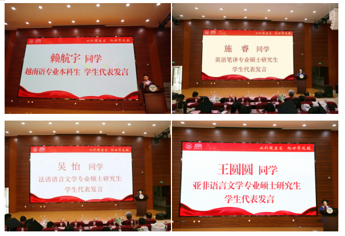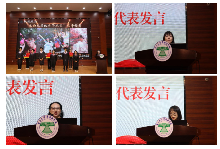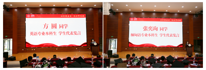 教师代表发言后,2019级英语专业本科生方圆、2019级缅甸语专业本科生张奕珣、2019级越南语专业本科生赖航宇作为本科生代表,2020级英语笔译专业硕士研究生施睿、2020级法语语言文学专业硕士研究生吴仪、2020级亚非语言文学专业硕士研究生王圆圆作为硕士生代表依次上台发言。六位同学分享了在云南大学外国语学院期间的收获与成长,表达了内心的不舍和对未来的期待,为毕业生们送上祝福。