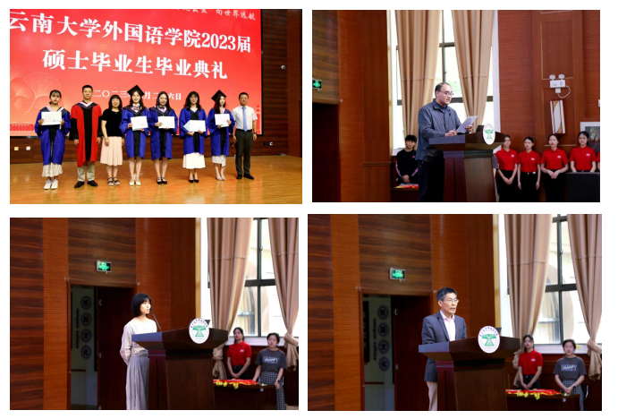 在硕士生毕业典礼上,学院党委副书记何淼淼宣读优秀硕士毕业生名单,由副院长王浩、谢萍、臧运发三位领导,为优秀毕业生代表颁发奖状及纪念品。随后,英语语言文学系刘衍老师、日语语言文学系郑雁天老师、东南亚语言文化系于在照老师作为教师代表依次发言,表达了对同学们的真挚祝福。刘衍老师回忆了过往三年,同学们从青涩懵懂变得更加成熟稳重,以情深意切的语言表达了对2023届硕士毕业生的美好祝愿。郑雁天老师用自己的研究生经历,以学姐的身份给予同学们真诚建议。于在照老师用“祝贺”“互勉”“祝愿”六个字,教导同学们要永跟党走,报效祖国;不断学习,完善自我;奋勇攀登,不懈努力;最后,祝愿同学们秉承“会泽百家,至公天下”的云大精神,从外院出发,展翅高飞,鹏程万里。