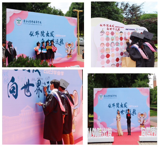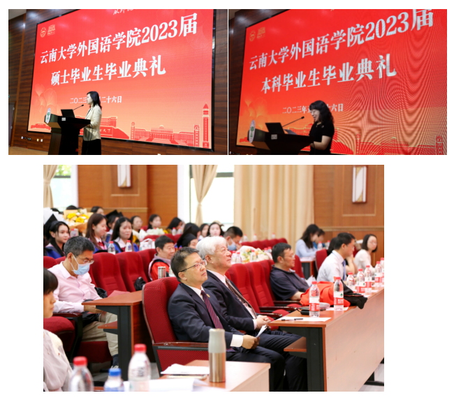 2023年5月26日,云南大学外国语学院2023届毕业生毕业典礼在外国语学院报告厅隆重举行。出席本次毕业典礼的领导和嘉宾有外国语学院党委书记王益广、院长刘树森、党委副书记何淼淼、副院长骆洪、副院长王浩、副院长谢萍、副院长臧运发、外国语学院各系办主任、副主任、教师代表,以及2023届全体毕业生。此外,本次毕业典礼还采用线上线下同步开展的形式,通过B站、微赞直播平台进行直播,让更多教师同仁、毕业生家长能够全程参与,共同为2023届毕业生送上最诚挚的祝福和期盼。本次活动由谢萍老师、何淼淼老师共同主持。