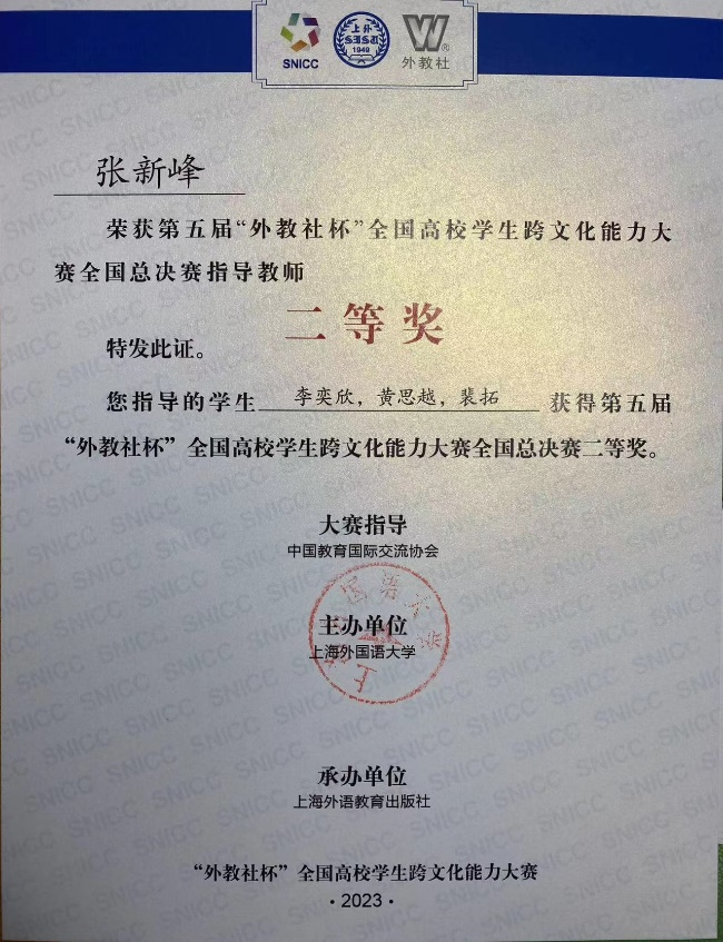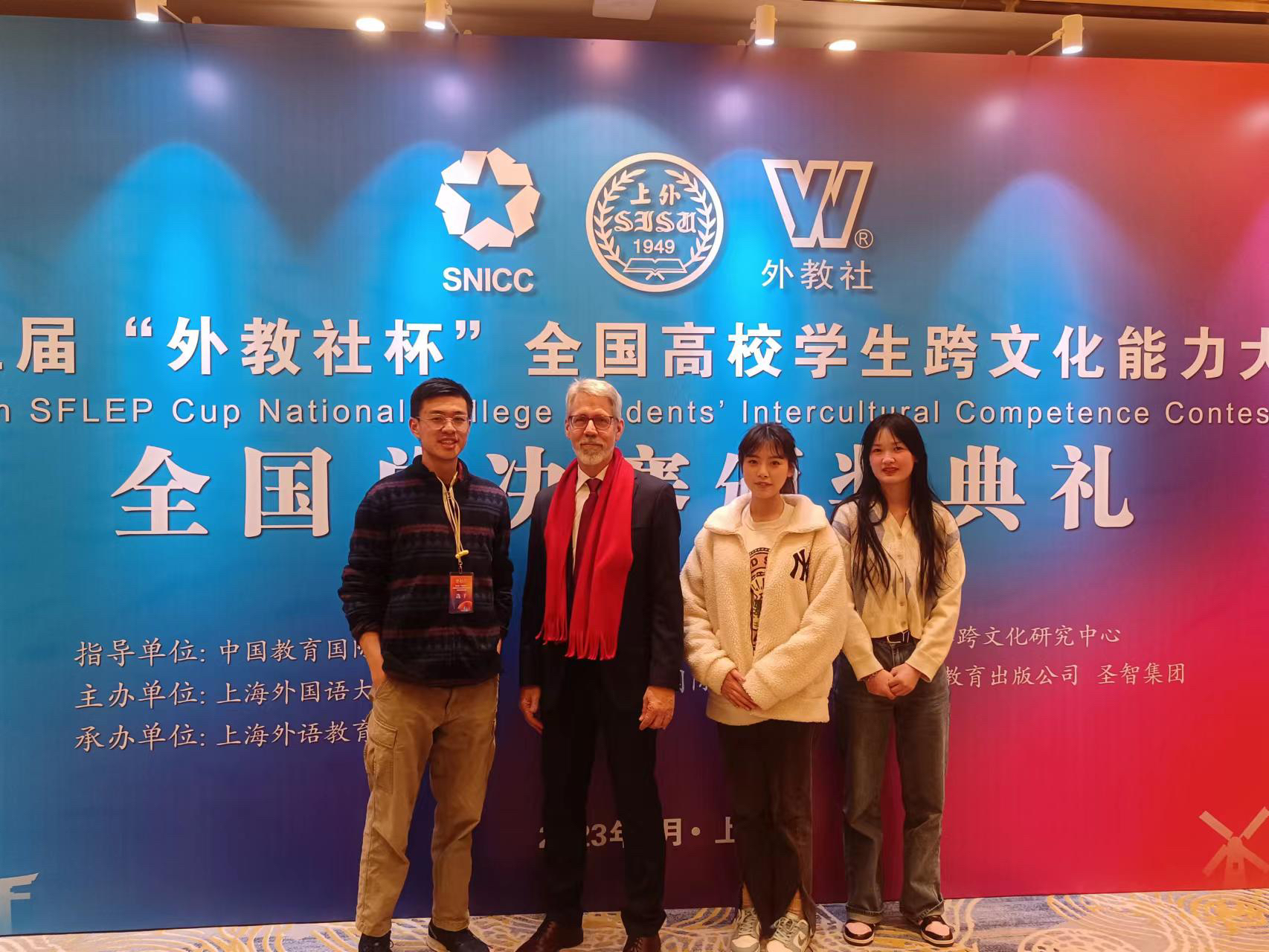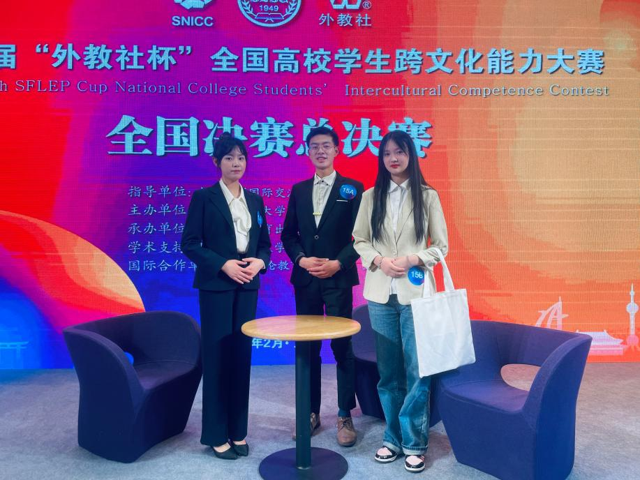 2月24日至26日,由上海外国语大学主办的第五届“外教社杯”全国高校学生跨文化能力大赛全国总决赛在上海举行。40支中国学生队伍和4支国际学生队伍历经校赛和省赛选拔脱颖而出,在全国决赛的舞台上同台竞技、大放异彩。我院本科生黄思越(2019级英语专业)、李奕欣(2020级英语专业)、裴拓(2021级法语专业)三位同学在张新峰老师的指导下取得了全国决赛二等奖的好成绩。