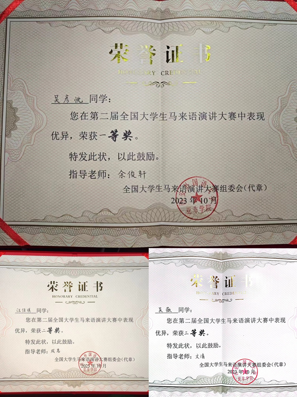 2023年10月28至29日,“第四届中国-马来西亚翻译、语言与文化国际研讨会暨第二届全国大学生马来语演讲比赛”在西安外国语大学举行,来自国内各高校的31位学生在此次大赛中同台竞技、相互切磋。我院马来语专业本科生吴彦忱、汪佳琪分别荣获低年级组一、二等奖,吴薇荣获高年级组三等奖,余俊轩老师获得优秀指导教师奖。