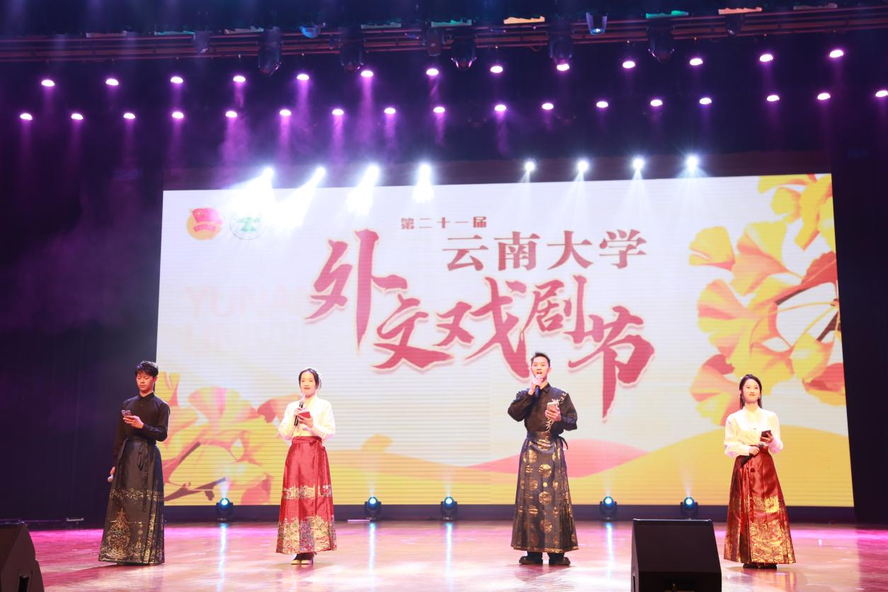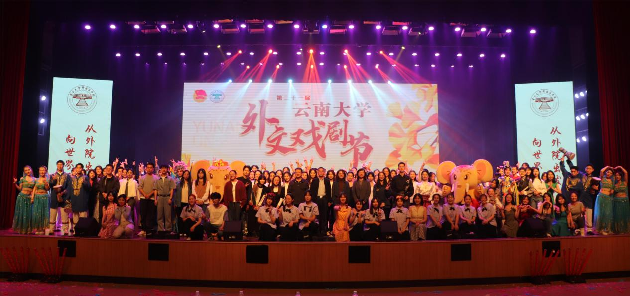 2023年11月10日晚,云南大学第二十一届外文戏剧节狂欢夜在云大学生会堂隆重举行。云南大学外国语学院党委书记王益广老师、党委副书记何淼淼老师、云南大学学生艺术团指导教师马梦怡老师、云南大学学生公寓管理中心主任张拥军老师出席晚会。参加本届晚会的还有云南新东方国际教育中心、新东方前途出国(昆明分公司),阳光心霖儿童公社、云南世纪文都教育科技有限公司、云南东润教育集团等院企合作单位,各兄弟学院、各职能部门领导和教师代表、各学院同学们共同观看此次晚会。