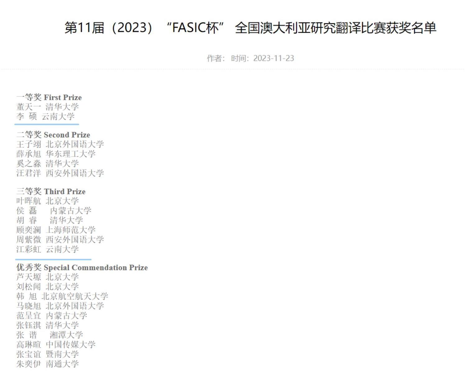 为促进中国高校学生对澳大利亚社会和文化的深入了解,北京外国语大学澳大利亚研究中心自2013年起组织举办年度澳大利亚研究翻译比赛,由在华澳大利亚研究基金会(FASIC,全称:Foundation for Australian Studies in China)提供赞助,2023年9月19日至25日举办了第11届比赛。我院2022级英语笔译研究生李硕、江彩虹表现突出,分别荣获本届比赛一等奖(与清华大学学生排名相同)、三等奖。