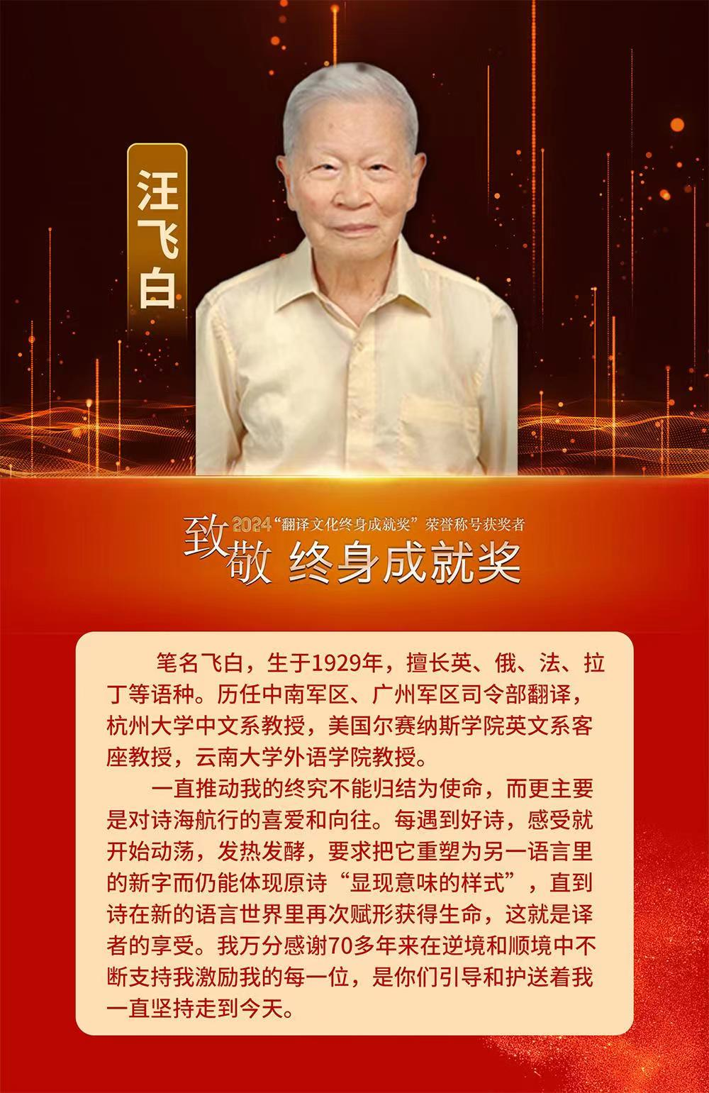 中国翻译协会2024年会3月30日-31日在长沙举行,本次年会由中国外文局、中共湖南省委宣传部、中共湖南省委外事工作委员会办公室、湖南省教育厅指导,中国翻译协会、中国外文局翻译院、湖南师范大学主办。在30日开幕式上,举行了中国译协“翻译文化终身成就奖”等奖项的颁奖表彰仪式,授予曾任毛泽东主席、周恩来总理等党和国家领导人翻译的唐闻生等13位著名翻译家“翻译文化终身成就奖”的称号。其中,在我院英语系长期执教、培养研究生近20年的著名外国文学翻译家汪飞白教授荣膺“翻译文化终身成就奖”。
