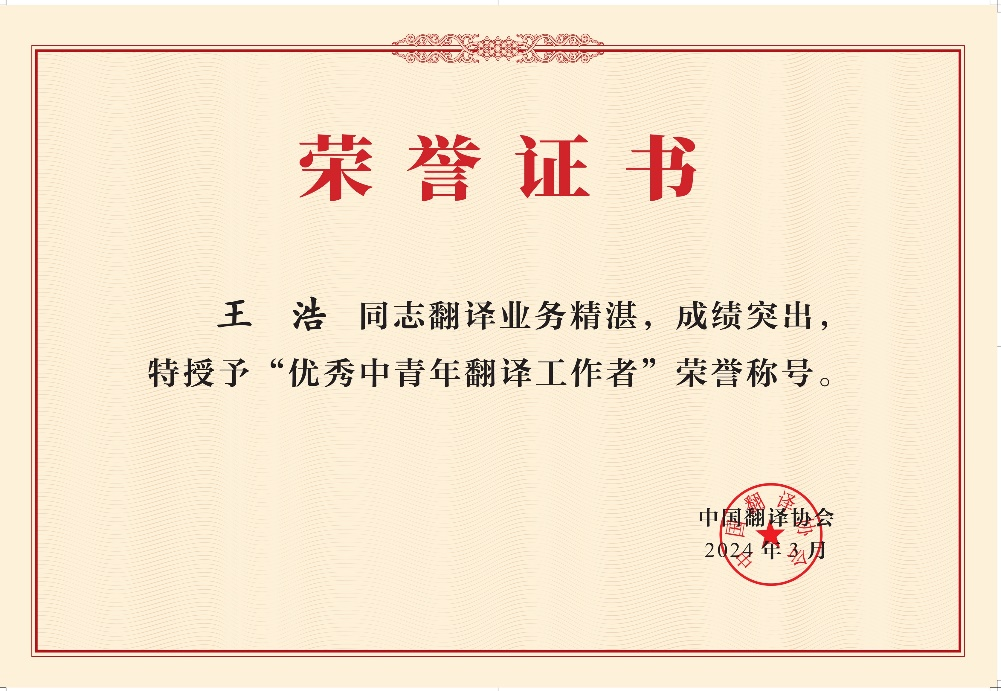 我院副院长、大学外语第二教研部教师王浩副教授在2024年中国翻译协会年会上被授予“优秀中青年翻译工作者”称号。