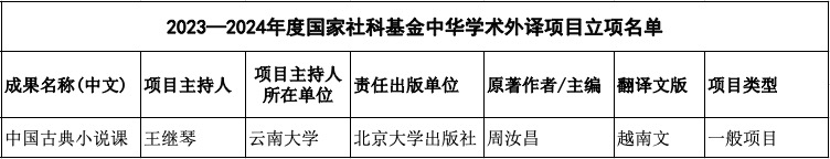 近日,全国哲学社会科学工作办公室公布了2023—2024年度国家社科基金中华学术外译项目立项名单,云南大学外国语学院东南亚语言文化系教师王继琴申报的《中国古典小说课》越南文外译项目获批立项。