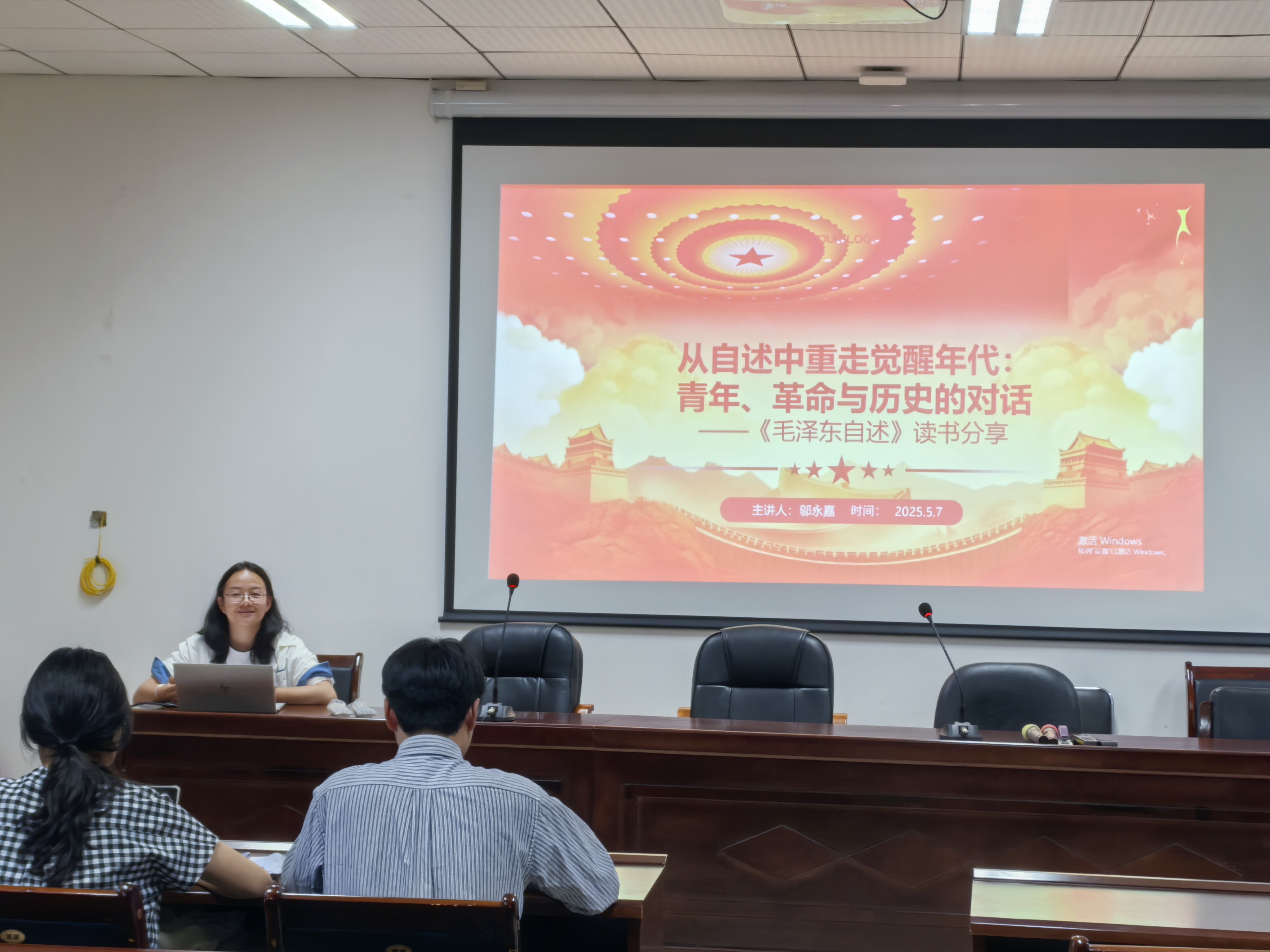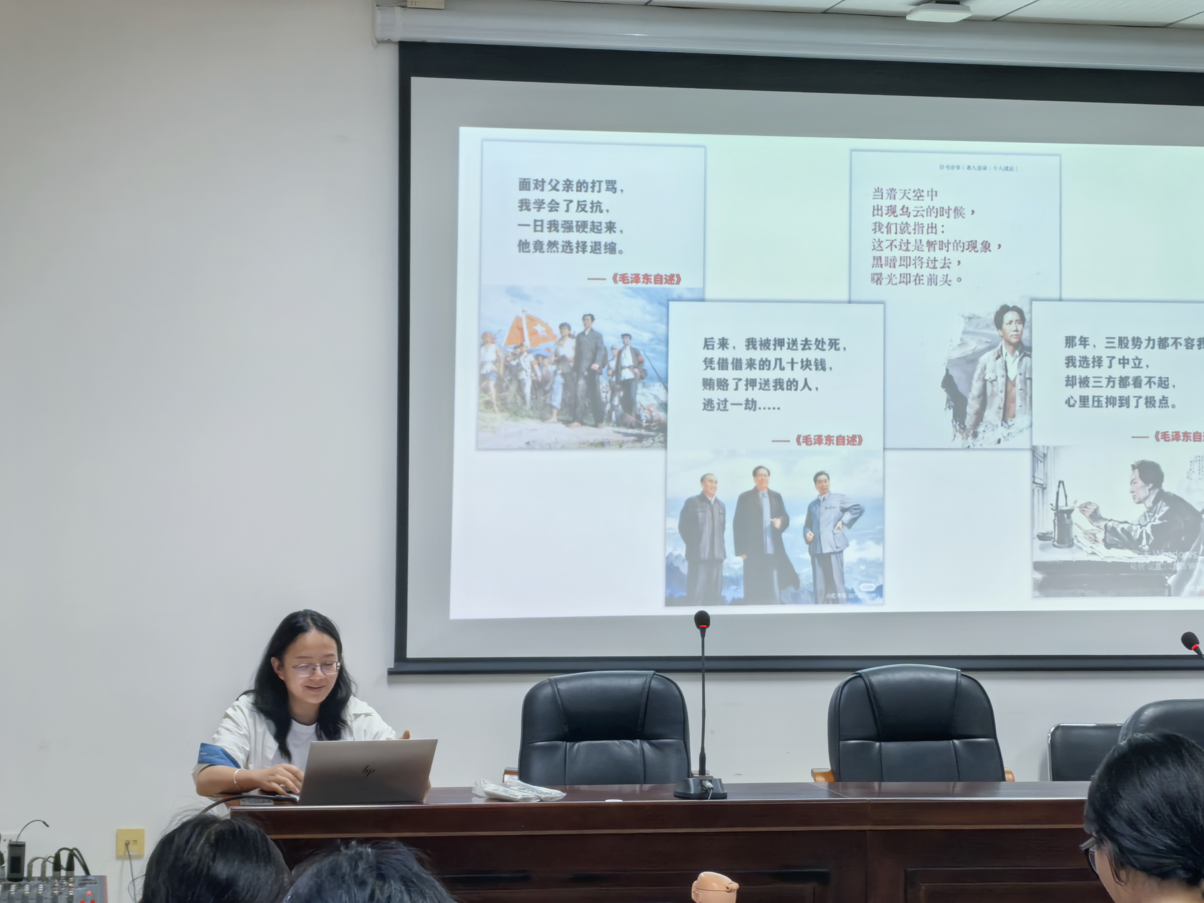 2025年5月7日晚,云南大学外国语学院学生第一党支部第三期“理解中国•知行有道”读书会在学院楼310教室顺利举行。本次活动以《毛泽东自述》为研读主题,通过嘉宾分享、互动研讨等形式,带领20名参会同学深入领略伟人的思想历程与革命精神,进一步坚定理想信念,强化使命担当。