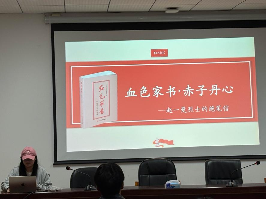 活动伊始,主持人曾伟简要介绍《红色家书》的基本内容:这部作品选编了百余封革命先烈写给亲人的书信,按“明志”“正己”“亲情”“教子”四个篇章分类,文字质朴深切,却承载着沉甸甸的信仰与担当。他指出,这些家书不同于一般的书信往来,它们既是血脉亲情的寄托,更是战火中理想信念的见证,是革命者在艰难岁月中对亲人最深沉的告白,也是对初心使命最真挚的回答。“读这些文字,是一次与信仰的对话;朗读这些片段,是一场穿越历史的心灵共振。”曾伟同学说道。他鼓励大家带着敬意与思考去聆听即将到来的家书朗读,感受文字背后的情感温度与时代回响,也思考今天的我们,如何理解“家国一体”的价值传承。